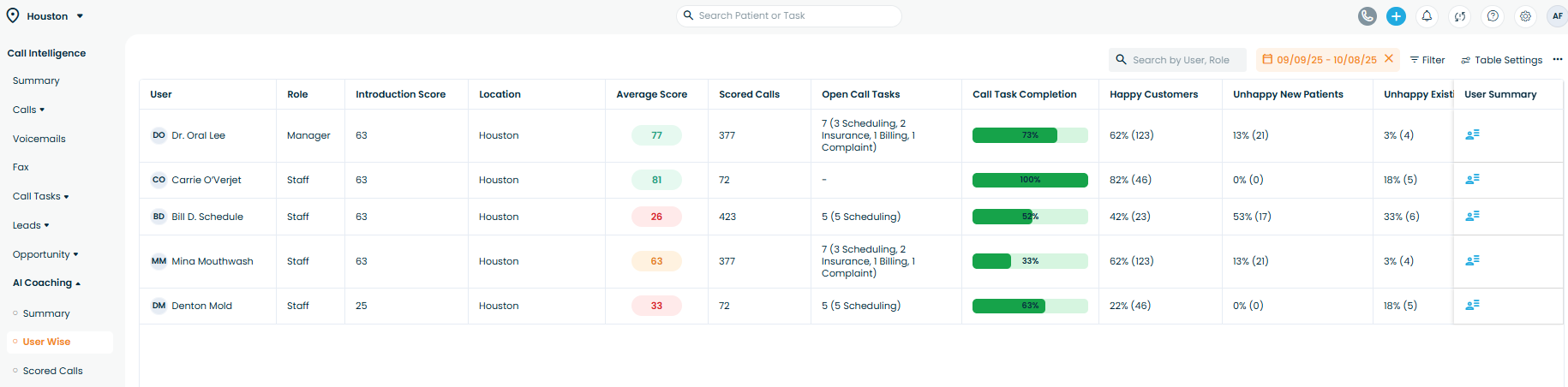 Use filters such as user, call type, source, patient type or outcome to see patterns. - Average Score by Call Type – Average score grouped by call types