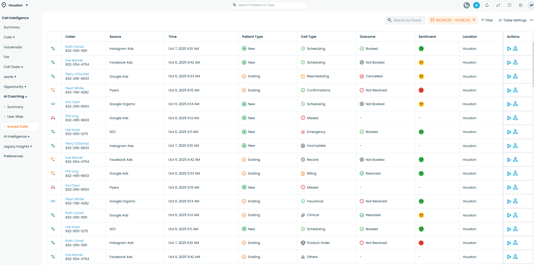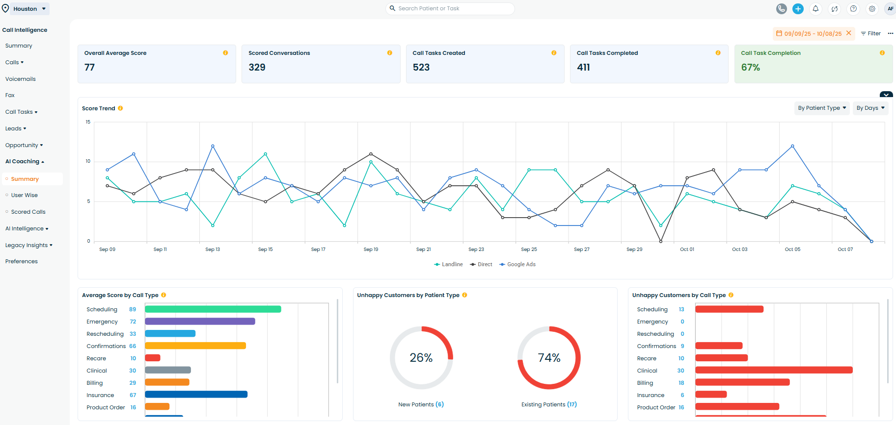 - Review specific calls behind a metric (for example, unhappy new patients or low scores in a time period).