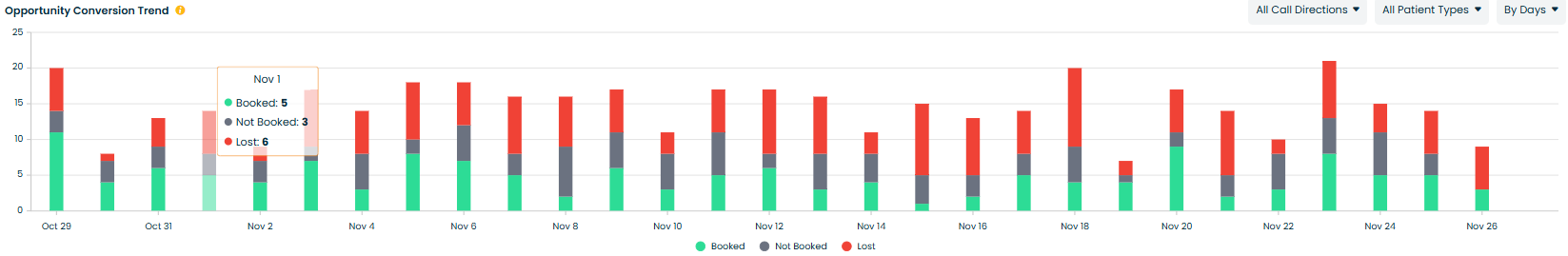 A daily or weekly trend showing how many patients contacted the practice to book and whether those opportunities were ultimately booked or lost.