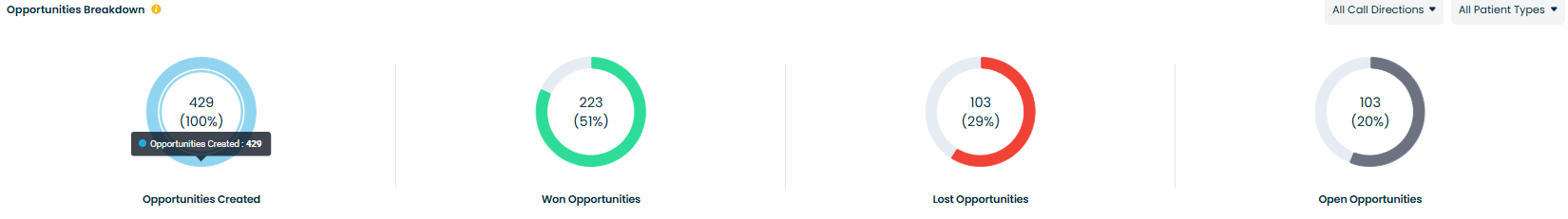 The Opportunities section in Call Intelligence provides a complete view of all scheduling opportunities generated from phone calls. It helps practices understand how many potential appointments were created, how many were won, how many remain open, and why some were lost. Use this guide to understand every KPI and chart shown in the Opportunities dashboard.