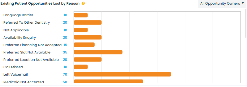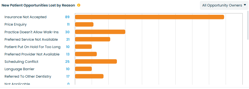 A breakdown showing why new patient opportunities were lost (e.g., price concerns, insurance not accepted, lack of availability, patient not ready, etc.).