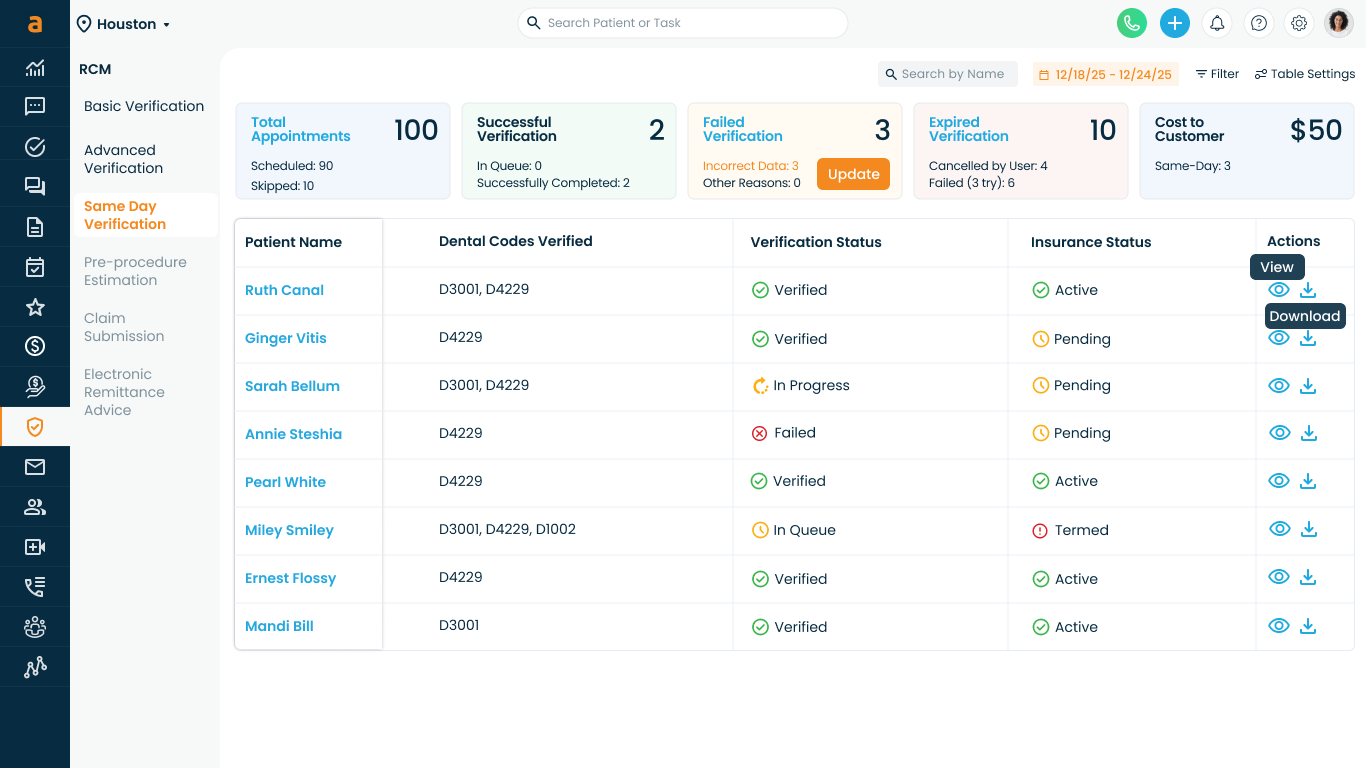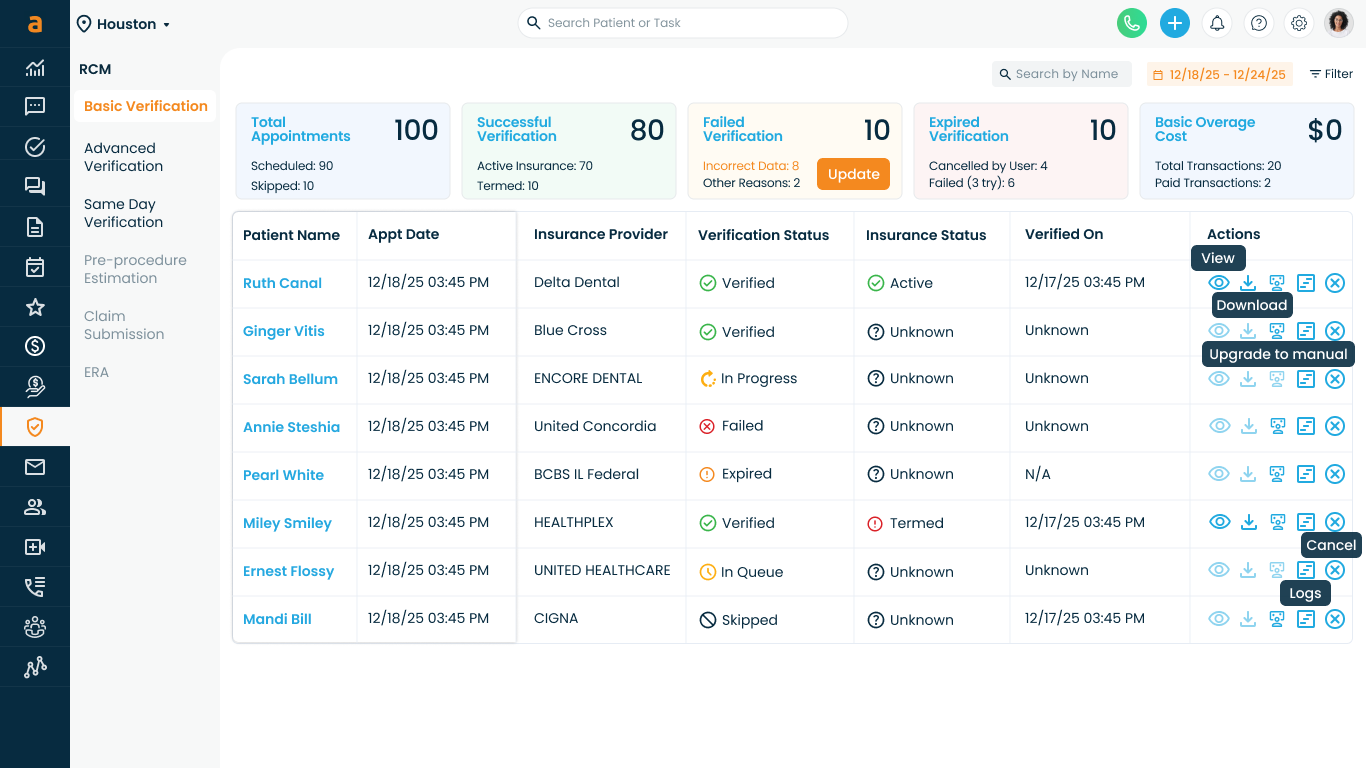 The Adit RCM team primarily handles insurance verifications in Adit. However, your practice team has full visibility into the real-time progress, outcomes, and eligibility status of every verification through the RCM module.
