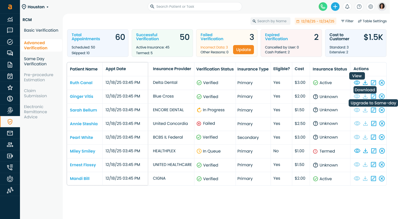 Once onboarding is complete, you will be redirected to the Insurance Verification Dashboard within the RCM module.