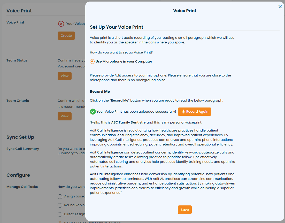 - Go to Call Intelligence โ Get Started โ Voice Print Criteria for Your Team