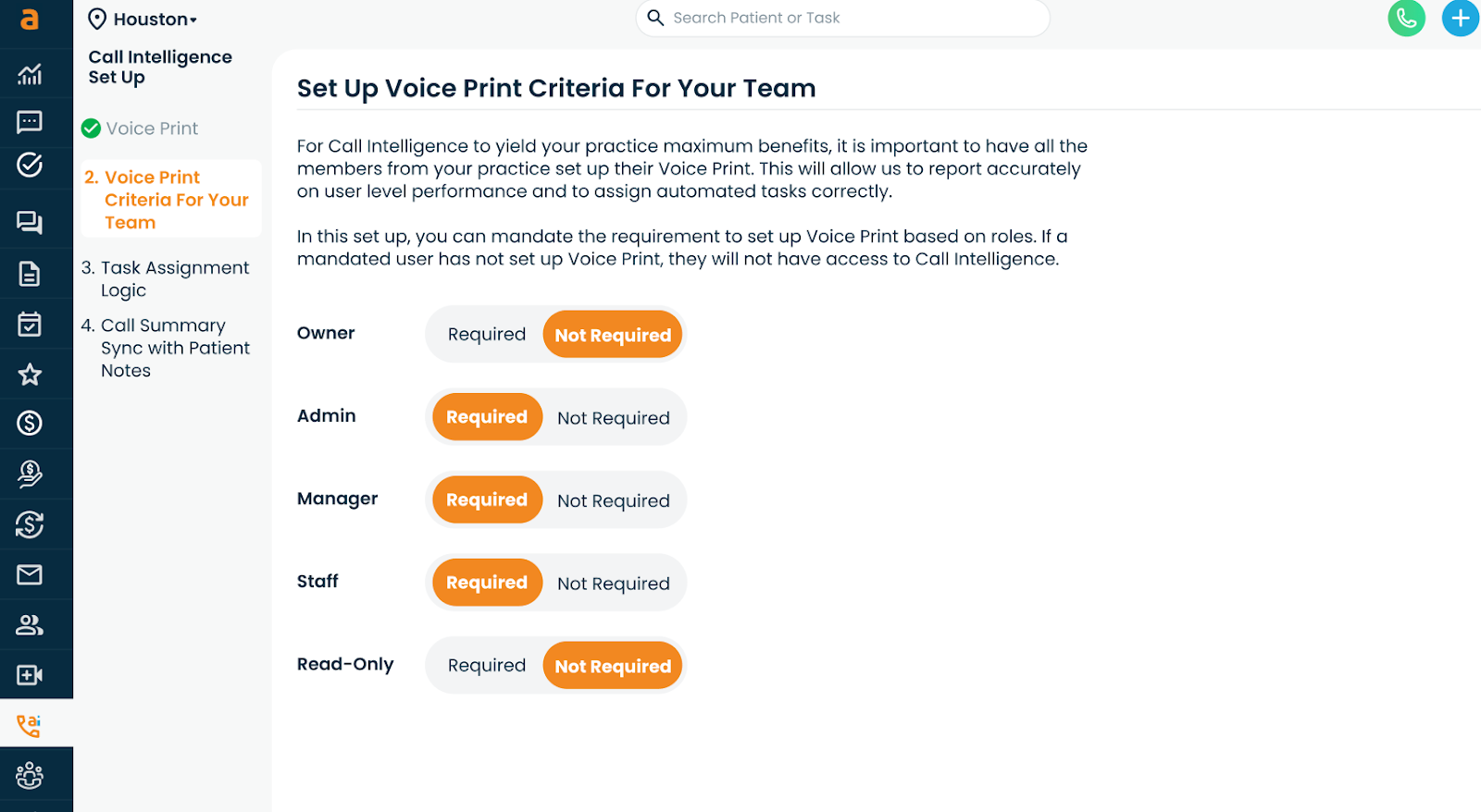 What it is: Control which roles must complete a voice print before accessing Call Intelligence.