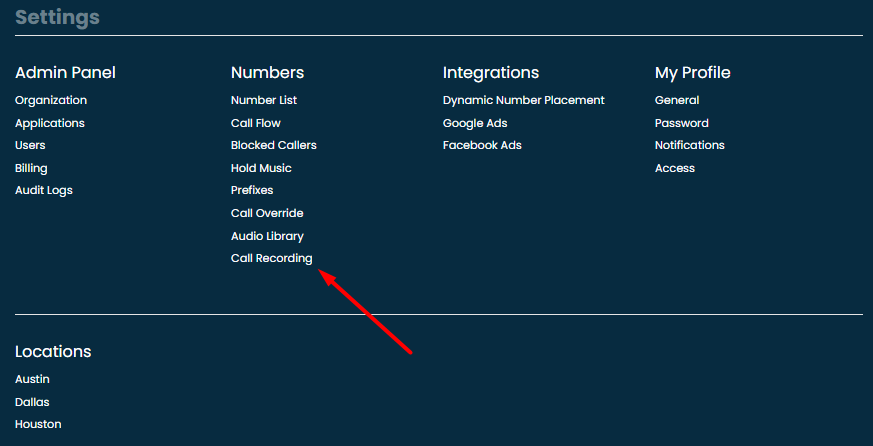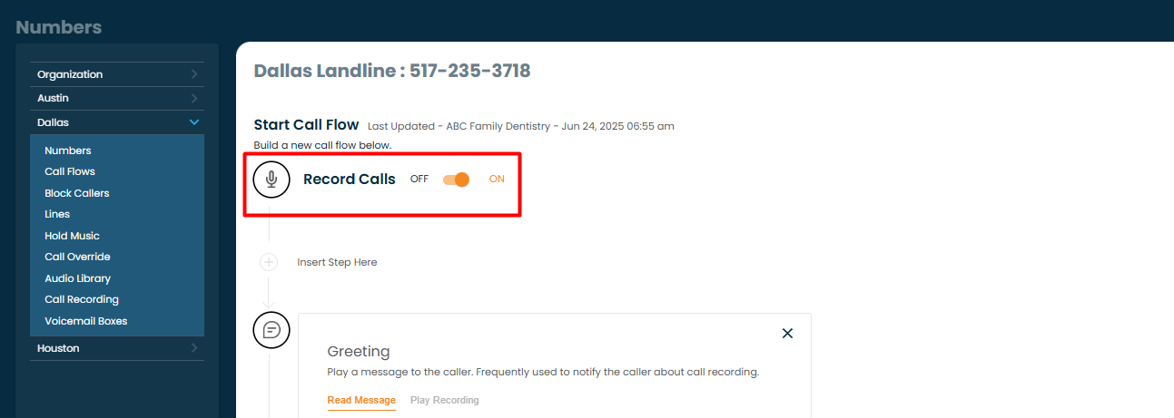 Repeat the inbound recording steps for each location’s main line number. Outbound toggles will already appear per-location under the Call Recording section.