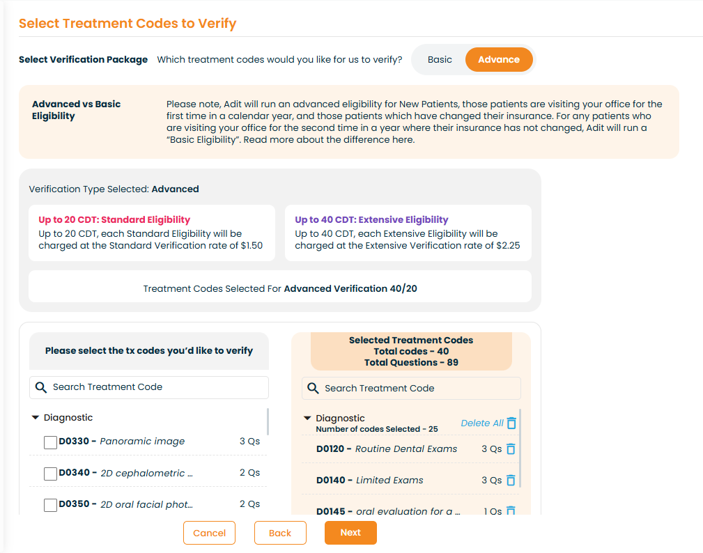 If no additional codes are selected, only the treatment codes defined in Preferences will be verified.