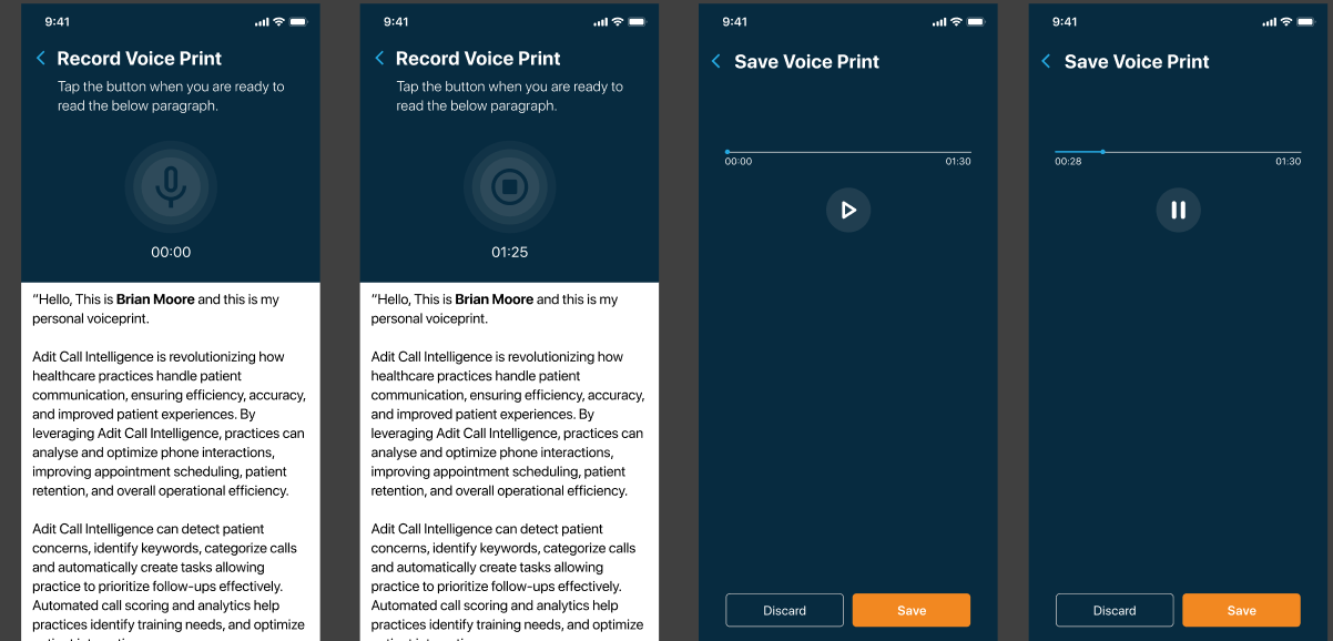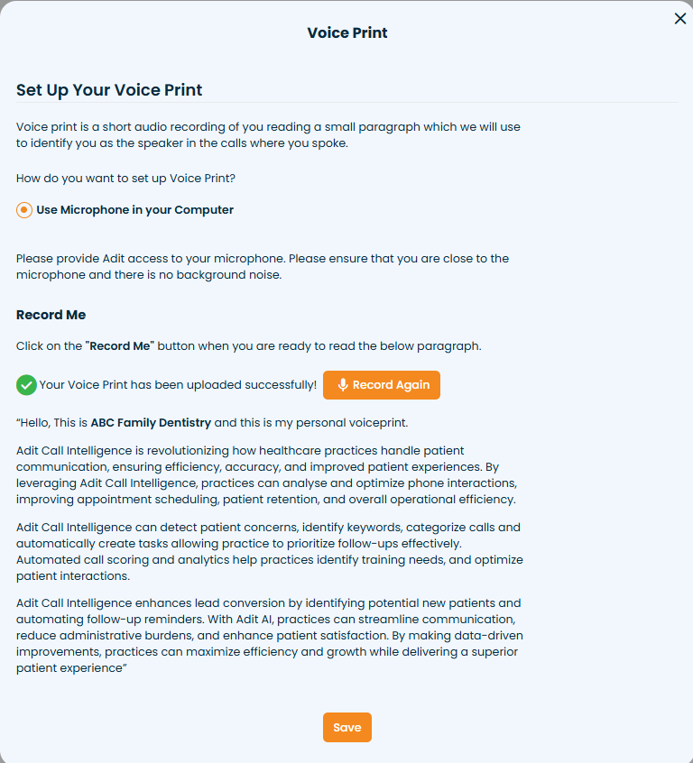 A Voice Print is a short recording of a user's voice that enables Adit Call Intelligence to identify who spoke on a call.