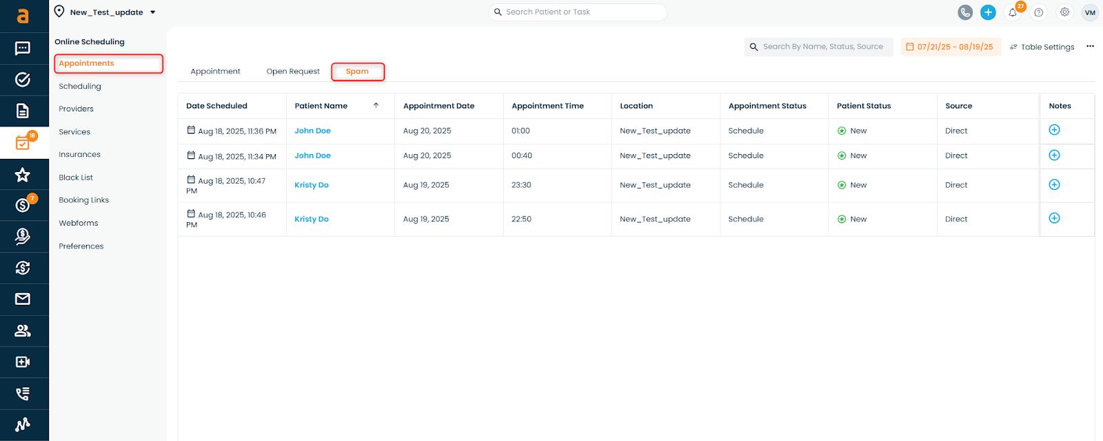 Open Online Scheduling and navigate to the Spam tab (under Appointments/Requests).