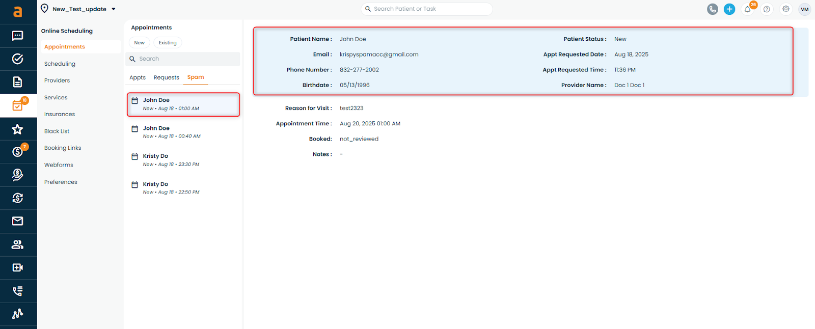 Once added, any patient who attempts to book online with matching credentials will be filtered out and marked as Spam in Adit