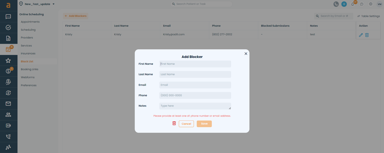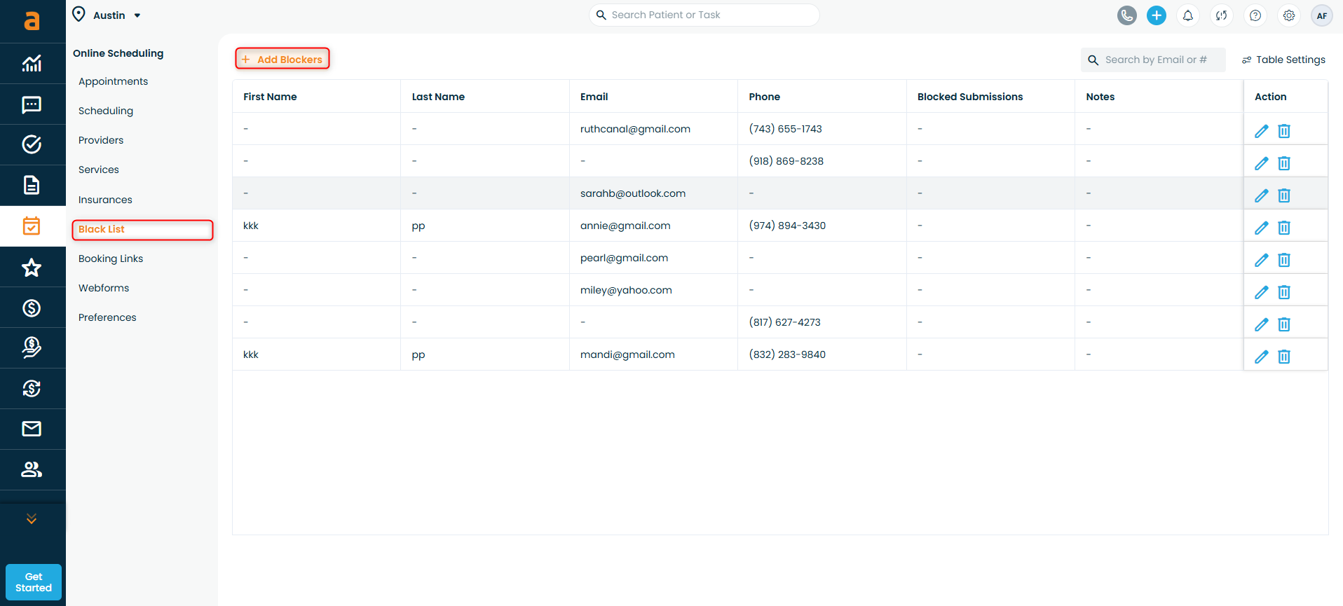 The Blacklist feature in Online Scheduling allows your practice to prevent patients from booking appointments online. This can be helpful for preventing patients who consistently no-show, and decreasing unwanted/spam bookings.