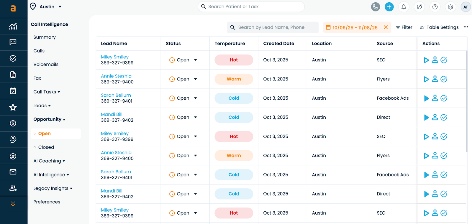The Open tab shows all opportunities that have not been booked yet and require follow-up from your team. These include calls from both new and existing patients where booking was possible but not completed during the call.