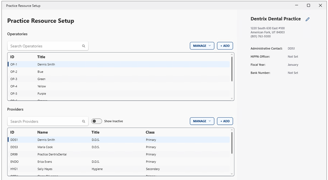 Operatories are used primarily when scheduling appointments. Dentrix comes pre-set with the following default operatories: OP-1, OP-2, and OP-3. You can add, edit, and delete operatories.