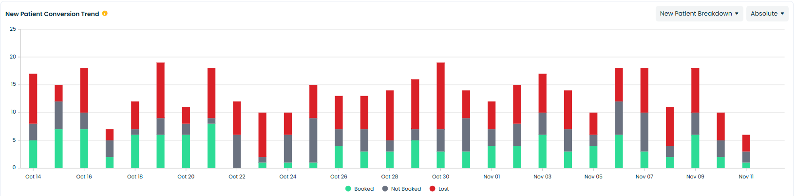 This chart shows how many new patient calls were booked, not booked, or lost over your selected time period. It helps visualize how your front desk’s conversion performance is trending day by day or week by week.
