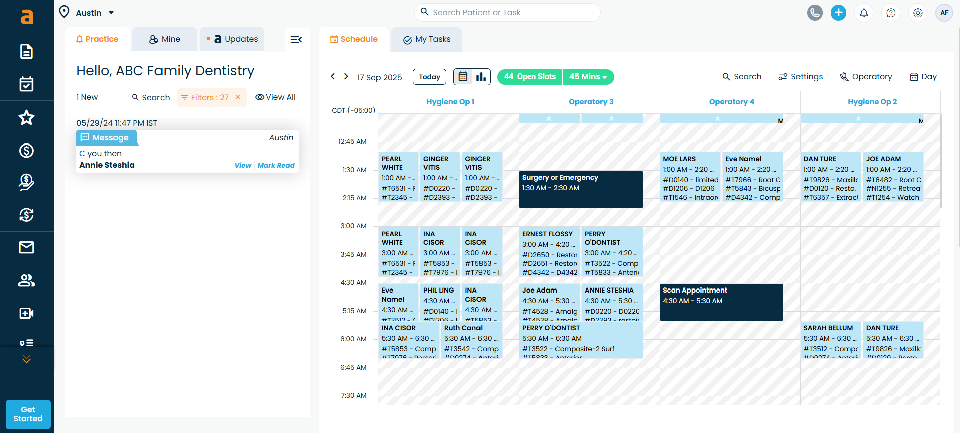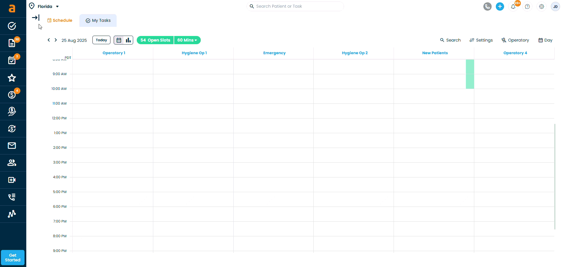You can quickly see appointments, open slots, and block-offs.