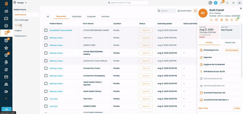 When viewing records like forms or patients, a third panel opens without leaving the main list view.