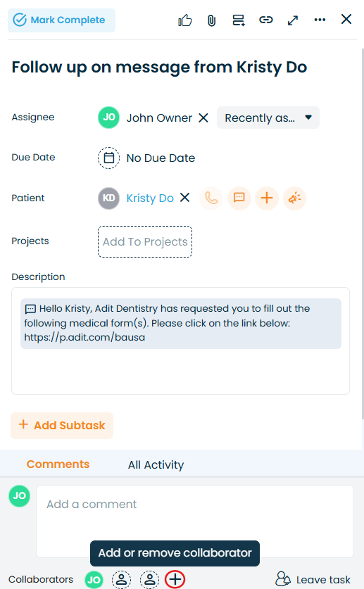 Note: Always add subtask assignees as collaborators on the parent task if you want them to see the full context.