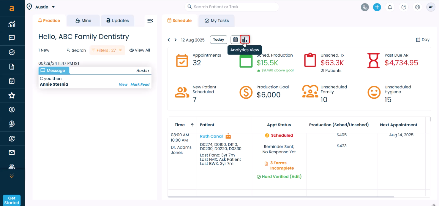 Function: Displays a quick summary of the day’s appointments, production goals, and pending tasks.