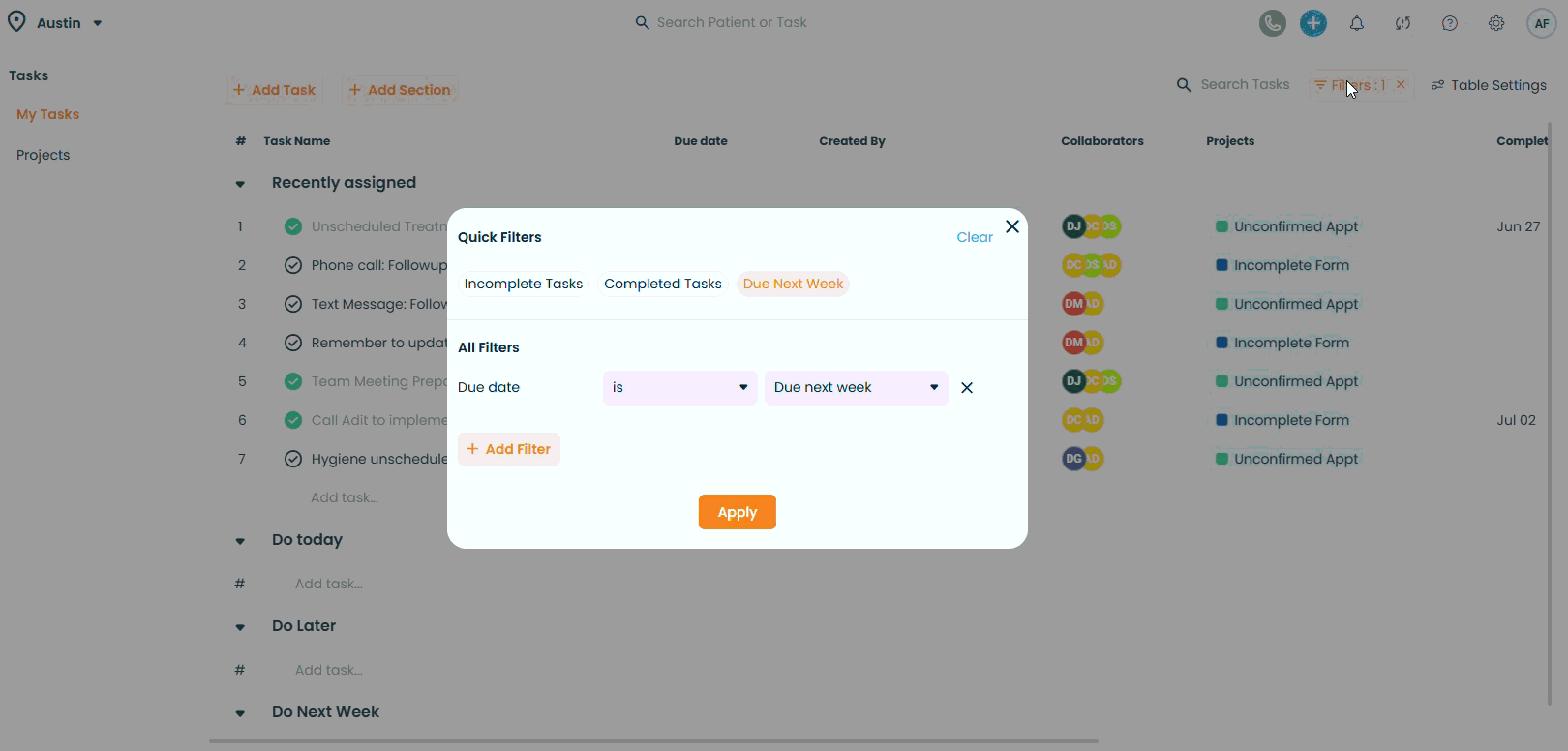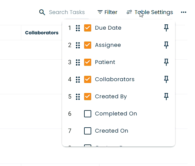 Show/hide columns (e.g., Due date, Assignee, Patient, Collaborators, Created By, custom fields).