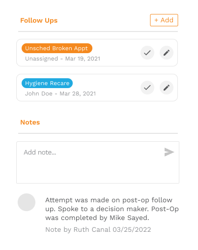 Follow Ups are also stored in this section, and you can create, edit, and log an attempt right from the Patient Card. Any notes logged regarding this patient, either manually or automatically by a Follow Up task, appears in the Notes section at the bottom.