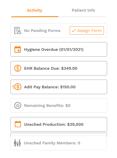 If you have Practice Analytics enabled on your account, you can see their Hygiene Status, Remaining Benefits, and Unscheduled Production, as well as Follow Ups and Notes.