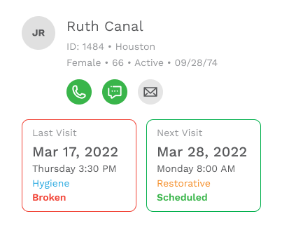 The top section of the Patient Card contains the patient’s name, ID, location, gender, age, and date of birth. There are also icons to Call, Text, or Email the patient, and a notation of the patient’s last scheduled and next scheduled appointments.